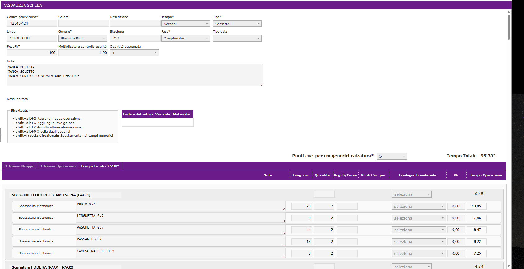 La Scheda Tempi consente di definire operazioni, gruppi di operazioni, materiali e generi di calzatura, restituendo report precisi sui tempi di produzione della tomaia e di altre fasi.